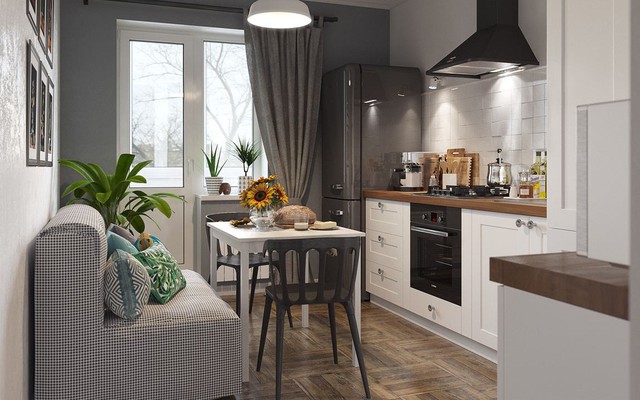 Khu nấu nướng được thiết kế hình chữ I giúp tiết kiệm tối đa diện tích cho căn phòng.